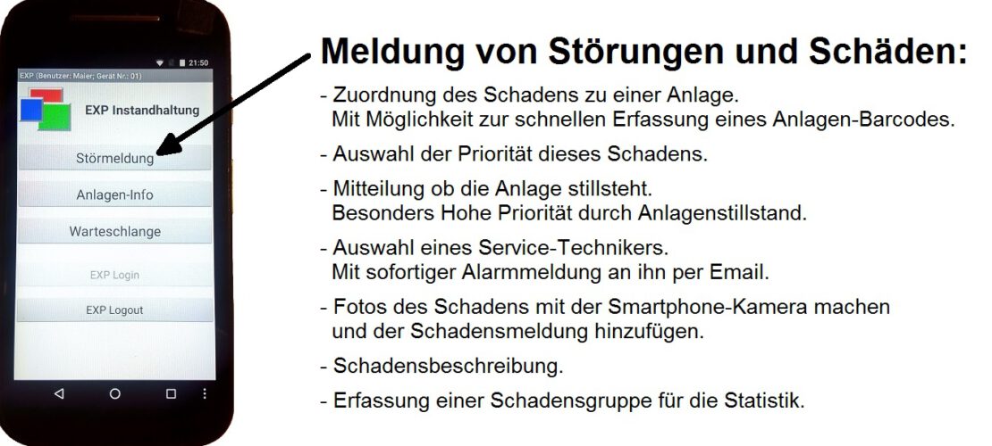 Mit dem EXP-Wartungsplaner können nicht nur Prüftermine verwaltet werden, sondern auch wiederkehrende Wartungsarbeiten, geplante Reparaturen und ungeplante Reparaturen. Außerdem können über verschiedene Wege Anlagenstörungen gemeldet werden. Zum Beispiel können Sie mit unserer App für Smartphone und Tablet Störungen mit allen notwendigen Daten erfassen und gleich mit dem mobilen Gerät ein oder mehrere Fotos der Anlagenstörung hinzufügen. Die Stördaten inkl. der Fotos werden dann von der App zum EXP-Wartungsplaner übertragen. Sofort wird vom EXP-Wartungsplaner eine oder mehrere Alarm-Email an vorab definierte Emailadressen versandt. Die Störungsmeldung wird im EXP-Wartungsplaner in der Anlagenhistorie gespeichert und ist für diverse Auswertungen und Dokumentationen verfügbar. Diese App kann sich z.B. jeder Ihrer Instandhaltungsmitarbeiter auf seinem mobilen Gerät installieren.