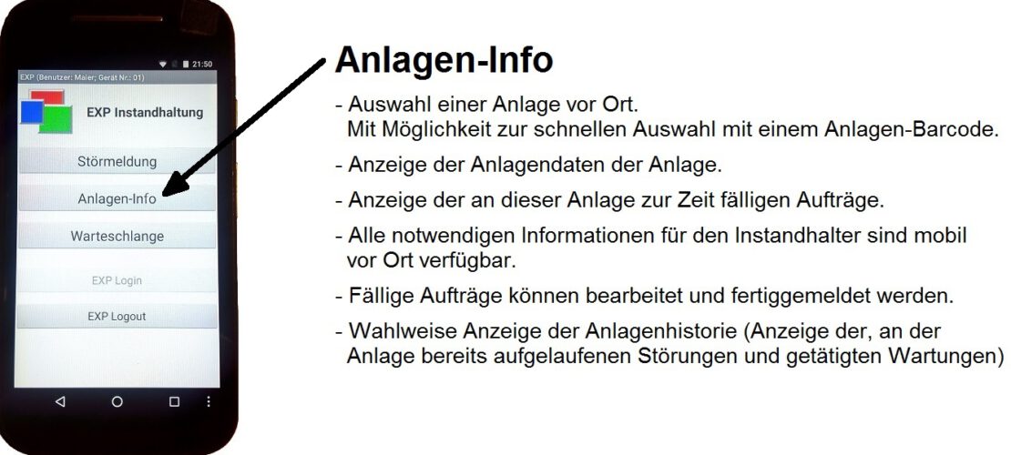 Erstellung von Barcodeetiketten für die Anlagen die von der App zur Identifikation der Anlagen genutzt werden.(Oder Nutzung von RFID-Tags) Aufträge werden mit der App vor Ort an den Anlagen aufgerufen bearbeitet und fertiggemeldet.